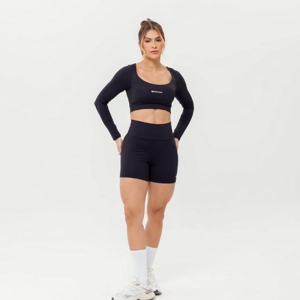 O TOp de manga longa proporciona um visual elegante e moderno com proteção solar adicional ou mais aquecimento, enquanto o short permite movimentos sem restrições.